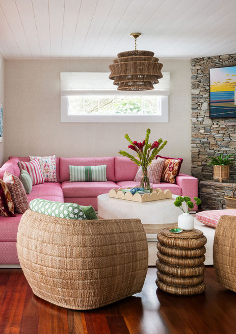 Our team completely renovated the first floor, including the kitchen and primary bedroom. Out went the beams, wood-plank ceiling, paneling, and built-ins—and in came new drywall covered in a grasscloth wallpaper, adding depth and warmth. The new den features a playful palm motif wall covering and two custom pill-shaped ottomans. All fabrics and rugs were carefully selected for their easy maintenance and versatility, with many being suitable for both indoor and outdoor use, allowing for a truly carefree beach house experience.